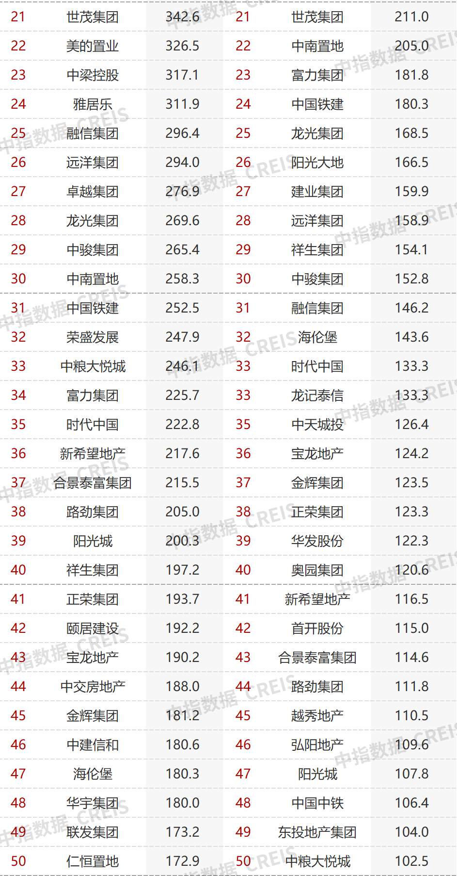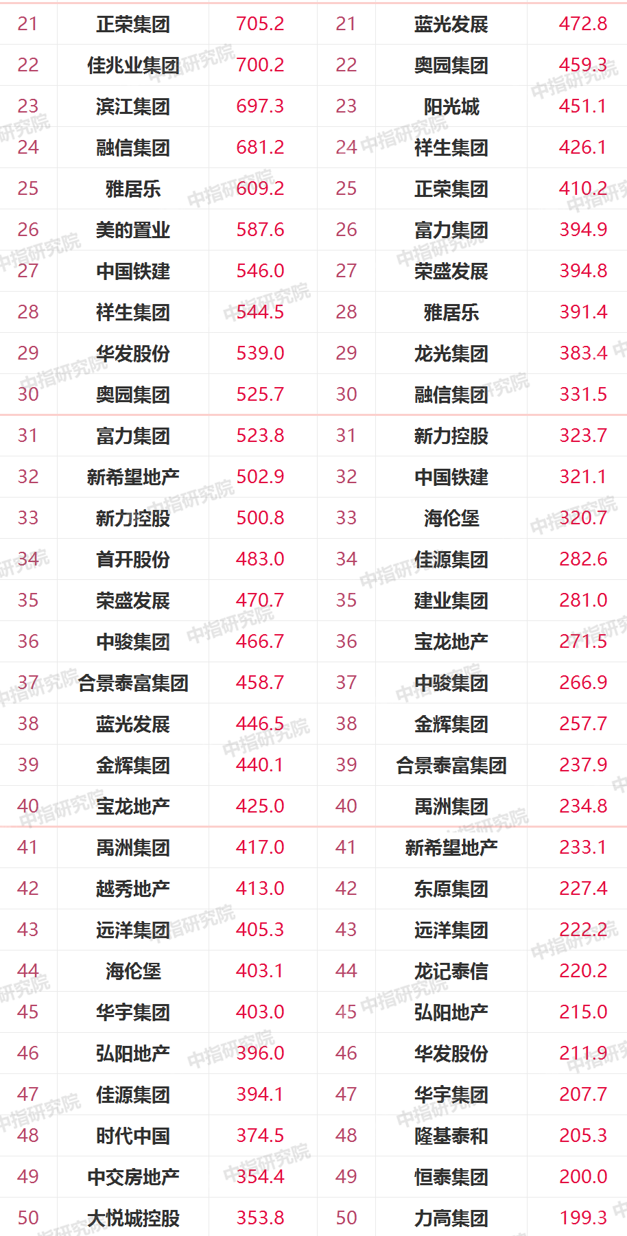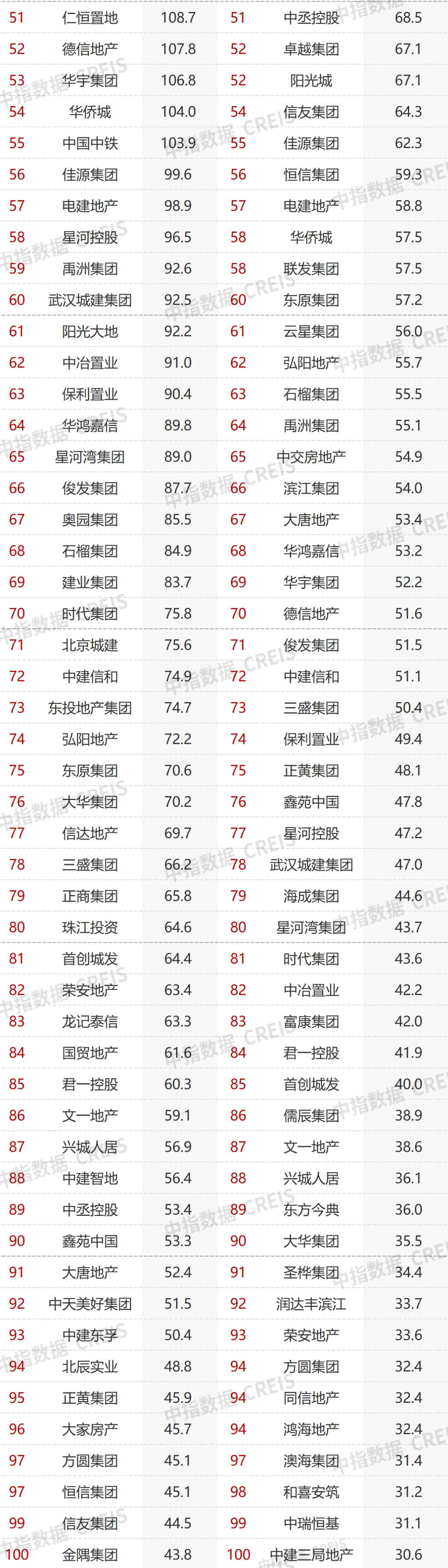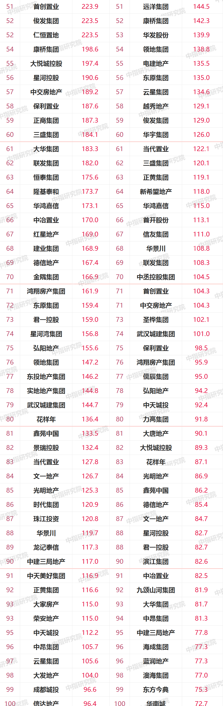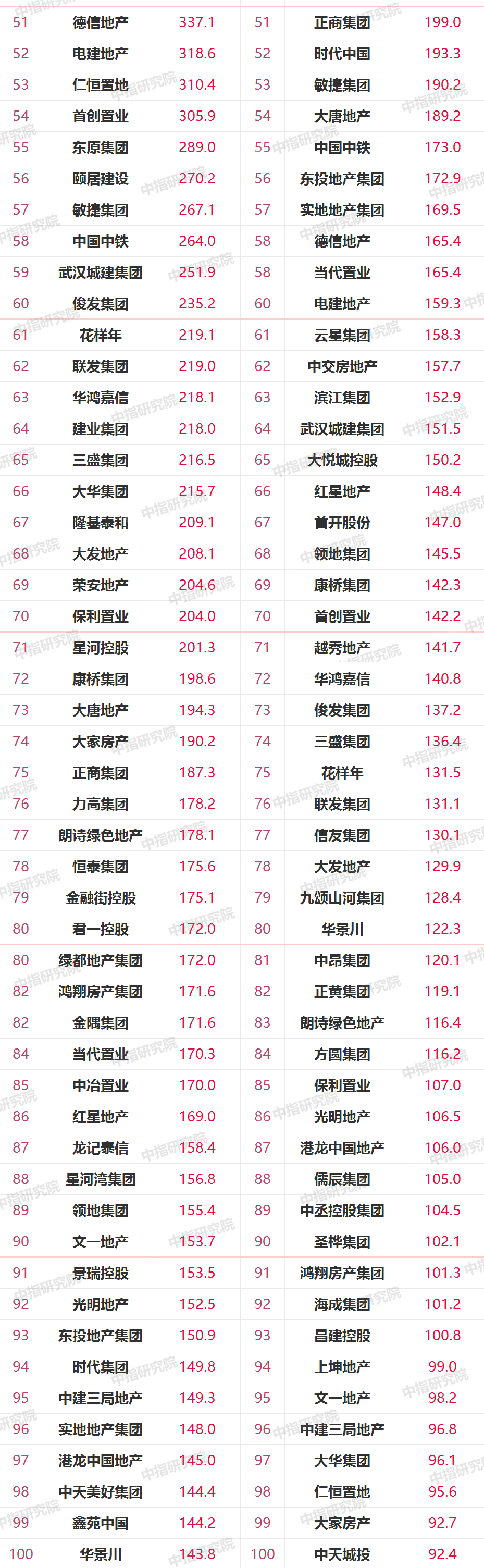 3)51-100位,俊發集團、華鴻嘉信、三盛集團、大華集團、大發地產、正商集團等降幅有點大,花樣年、當代置業好像有點放飛自我。仁恒置地略有提升,位次從2021年前5月的53位,殺入前50,剛好50名。聯發集團也殺入前50,49。中建三局地產也從95提升到51,差點就殺入50。