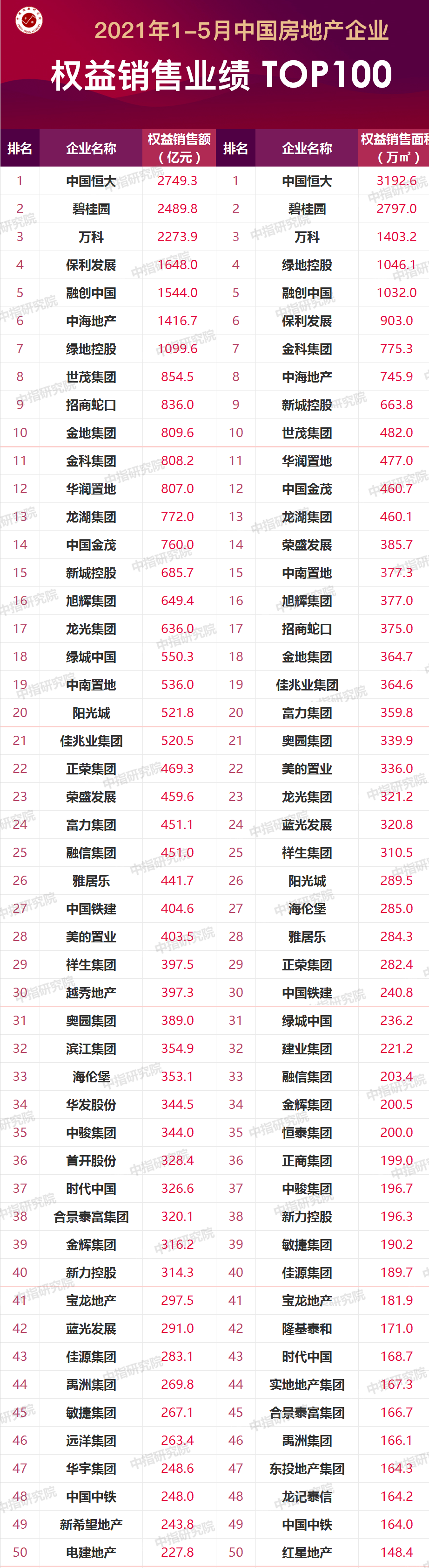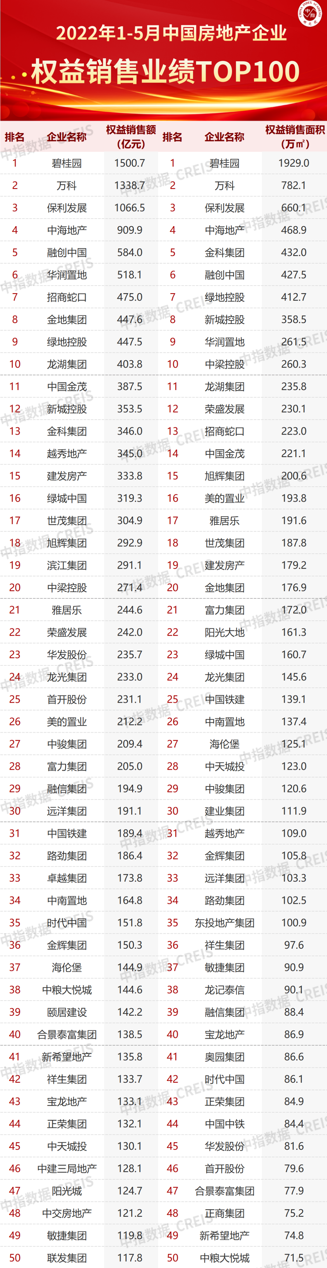 2022年5月31日傍晚,中指研究院發布了“2022年1-5月中國房地產企業銷售排行榜”。