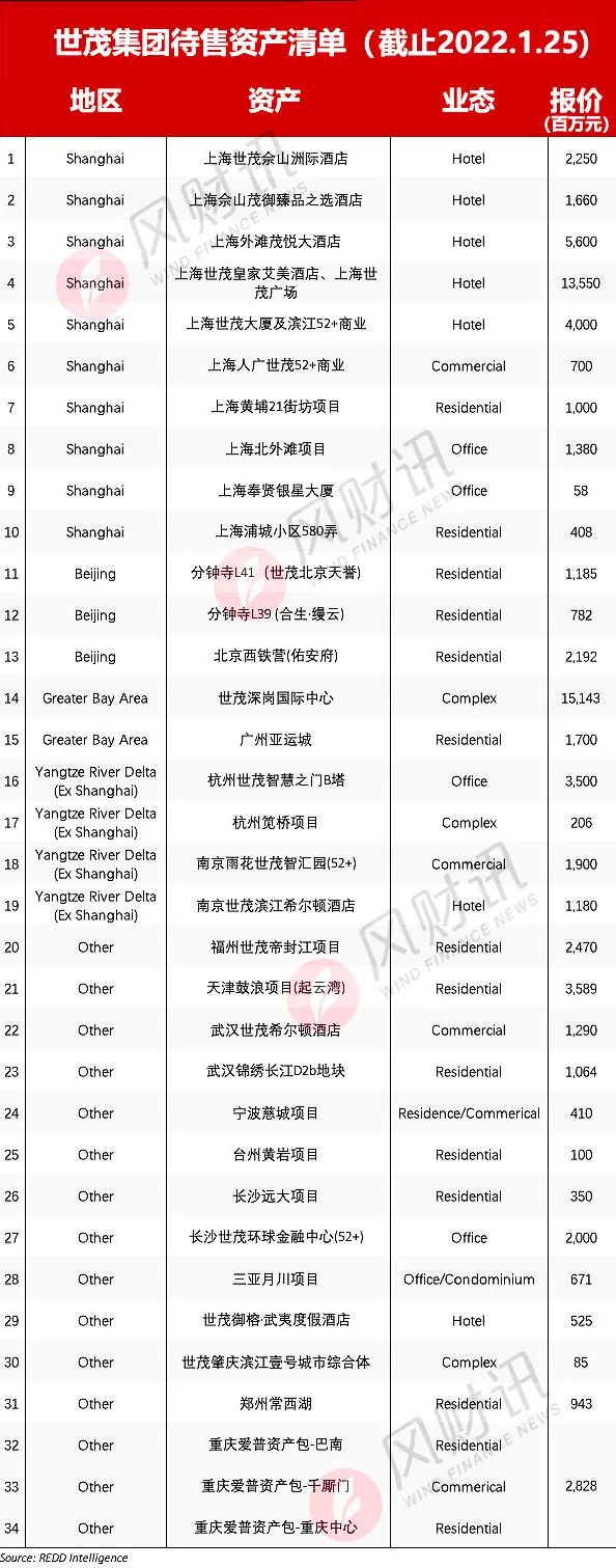 風(fēng)財(cái)訊從世茂待售資產(chǎn)包看到,34個(gè)重點(diǎn)項(xiàng)目,以綜合體商辦為主。上海世茂廣場(含皇家艾美酒店)和世茂深港國際中心兩個(gè)項(xiàng)目報(bào)價(jià)都超過百億,分別為135.55億和151.43億元;