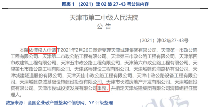事件回顧:2021年3月1日,天津市第二中級人民法院公告稱,本院依債權人申請于2021年2月26日裁定受理天津城建集團有限公司(以下簡稱“城建集團”)等17家公司重整,并指定天津城建集團有限公司清算組擔任管理人。