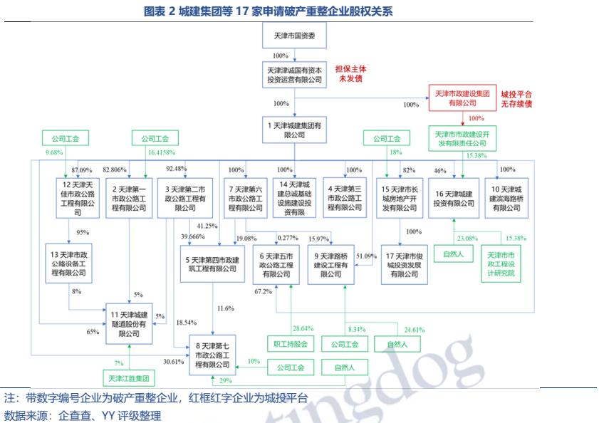 本次破產重整的17家企業中無發債平臺,而且穿透股東來看,僅涉及兩個發債主體:1)已無存續債的天津市政建設集團有限公司,僅間接參股了城建集團一個破產重整的子公司15.38%股權,按其注冊資本6,500萬元計算約1,000萬元。2)上層股東津誠國投,自身未發債,僅為一只19天房01債提供擔保(發行人為天房發展,二股東是違約主體天房集團)。作為肩負國企混改推介職能的國有資本運營公司,津誠本身即被裝入了許多“困難”國企。因此,整體來看,城建公司破產重整并不涉及城投信仰,破產重整目的也是為了減輕政府負擔,并不會為本就清冷的區域再融資“雪上加霜”。
