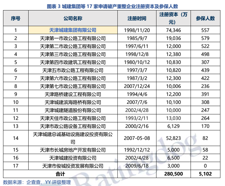 穿透股權,除城建集團以外,本次重整企業均是城建集團有限公司的子公司,來自路橋施工業務及房地產相關業務板塊,合計注冊資本約28億元,合計參保人數約5,100人。截至申請破產重整日,城建集團及子公司都無發債記錄。