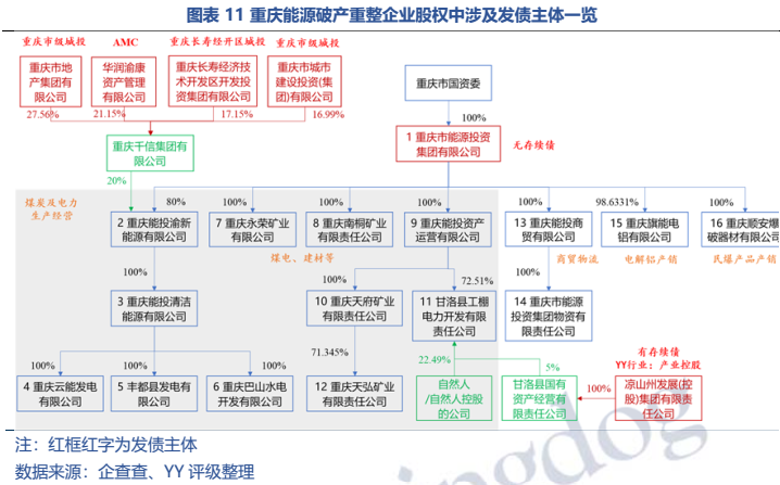 (3)邊緣化弱國企,對區域城投及產業主體波及面小。重慶能源在市場化轉型中,已逐漸剝離城投業務,歸類至弱國企范疇。穿透股權關系來看,僅有兩個破產重整企業的股東中存在當地城投及產業主體,均為參股關系,穿透股權較小。從業務關聯來看,21年中報顯示,重慶能源有約108億元應付款項,未披露應付對象,但從公司業務性質來看,未直接涉及建筑施工這類城投上游業務,推測與城投業務關聯可能性較低。