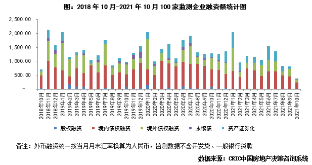 融資總量:2021年10月100家典型房企的融資總量為367.35億元,環比下降54.5%,同比下降71.3%,融資量達到歷年來新低,行業調控持續下,政策以及監管在窗口指導方面對各個融資方式加大審查力度,同時受行業多企業遭遇財務暴雷影響,房企當前融資較為困難,融資量走低,至此自2020年11月份以來,房企的單月融資連續12個月均呈現同比下降。從融資結構來看,境內債權融資241.37億元,環比下降47.6%,同比下降60.9%;境外債權融資99.04億元,環比下降61.5%,同比下降76.8%,隨著近期多家企業境外債償付展期或者違約,境外融資發行幾乎“暫停”;本月資產證券化融資12.00億元,環比下降86.7%,同比下降91.3%。