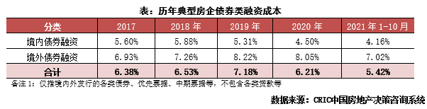 融資成本:2021年截至10月100家典型房企新增債券類1融資成本5.42%,較2020年下降0.79個百分點,其中境外債券融資成本達7.02%,下降1.03個百分點,境內債券融資成本4.16%,較2020年下降0.34個百分點。單月來看,10月房企融資成本5.68%,環比上升0.06個百分點,同比下降0.46個百分點。其中境外融資成本11.75%,環比上升3.66個百分點,增長較大;境內融資成本3.48%,環比下降0.01個百分點。房企融資利率在2.90%-14.20%間,境內發行債券有金茂、綠城、華僑城等企業發行,利率基本在4%以下,而境外發債的企業債券發行融資成本最高達14.20%,企業融資持續分化。