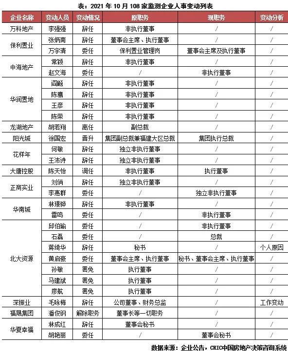 10月,房企高層人事動態信息數量較前兩月有明顯上升,從108家監測企業的人事變動情況來看,不少房企對組織架構進行了調整,高層變動頻率和數量同環比均有所上升。