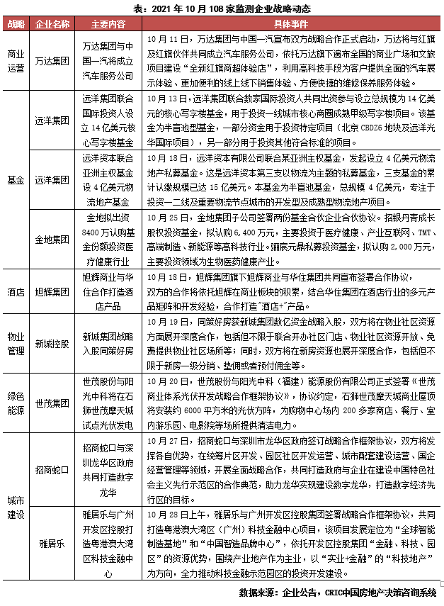 本月房企多元化業務呈現多樣化趨勢,綠色能源成為新亮點。對房企而言,綠色能源是較為冷門的多元業務,世茂集團本月有所突破。基金則延續上月熱度,遠洋集團和金地集團分別推出了特定方向的私募基金。物業管理方面,新城集團與同策好房將在物業社區資源和新房銷售方面展開深度合作。城市建設方面,招商蛇口和雅居樂嘗試科技地產領域。商業運營和酒店方面,也有房企陸續參與,擴大自身影響力。