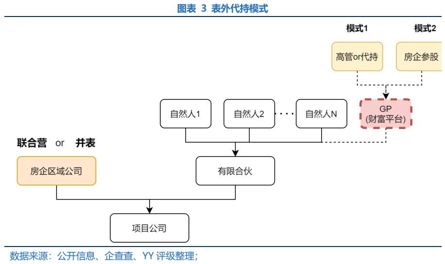 取決于理財(cái)產(chǎn)品參股的項(xiàng)目性質(zhì),則自融的表外負(fù)債或藏于“子公司明股實(shí)債”或“聯(lián)合營(yíng)表外負(fù)債”,而財(cái)富平臺(tái)多利用GP身份持少股并由企業(yè)高管代持,僅少部分房企的財(cái)富平臺(tái)為企業(yè)逕直持股。
