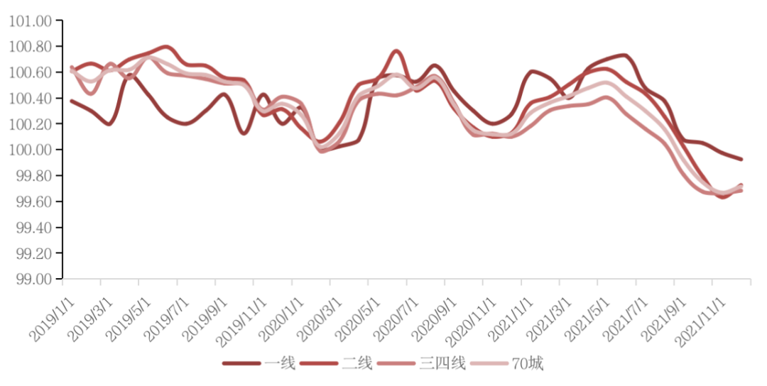 從各能級城市表現來看,12月份,一線城市新建商品住宅銷售價格環比下降0.1%。其中,廣州、深圳分別下降0.6%和0.1%。二線城市新建商品住宅和二手住宅銷售價格環比均下降0.3%。三線城市二手住宅銷售價格環比下降0.5%。