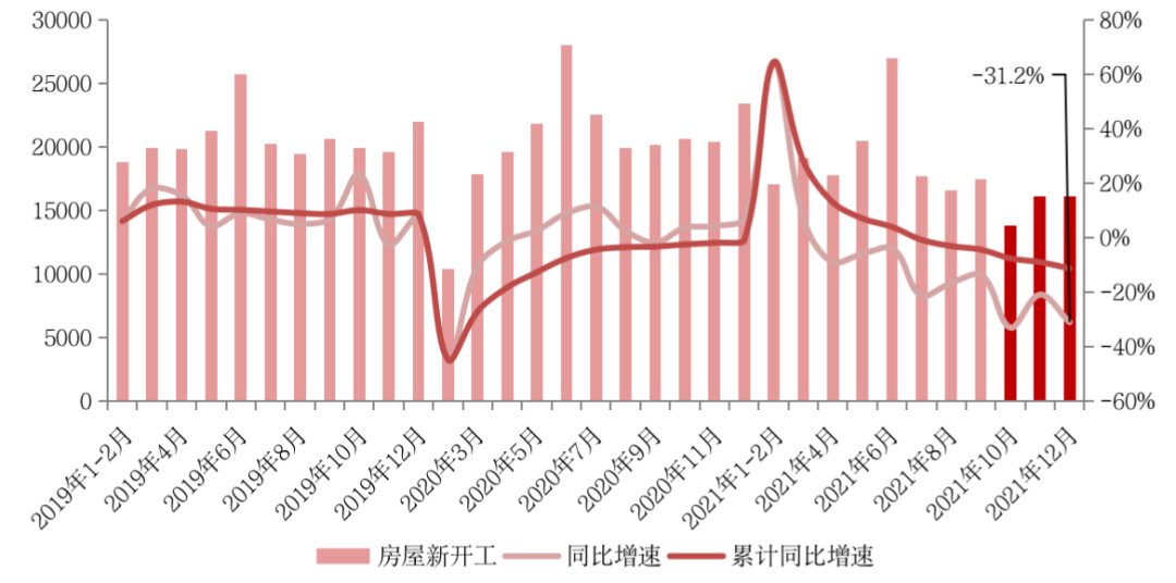 單月來看,12月全國房屋新開工16075萬平方米,環比11月持平,同比降幅擴大至31%,較11月擴大了10個百分點。傳統“年底開工潮”不再,這也意味著,民營開發企業當前仍處于較大困境中。