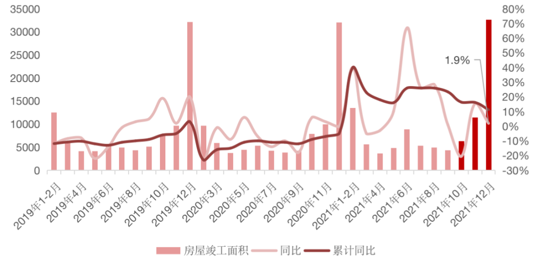 從12月新開工和土地購置面積超30%的降幅來看,已無力支撐起行業投資規模。房屋竣工面積的高量表現則對收窄整體投資增速降幅有一定幫助。