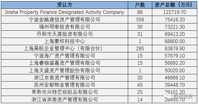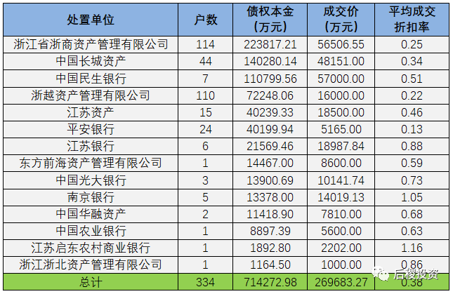 從阿里拍賣平臺中篩選出江蘇地區(qū)債權(超過1000萬)成交記錄,總成交戶數334戶,成交債權總本金超71.4億,總成交價26.97億元。具體情況如下表所示: