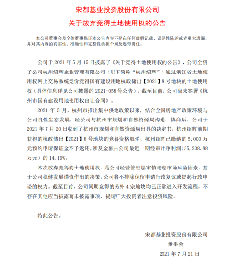 在杭州首輪土拍中,按照原計劃,宋都本來是想拿三塊地,那是他們最舒適的狀態。但因為杭州是熱點城市,爭搶的房企太多,宋都一激動就拿了五塊地。因為開發商們的哄搶,杭州也成為22城首輪集中供地的最大贏家,兩天攬金1197億。集中拍地過后的2個月零12天,宋都發布了放棄競得土地使用權的公告:關于宋都退地,官方給的解釋很簡單:審慎考慮市場風險因素,基于公司穩健發展謹慎作出的決策。結合幾個月前轟轟烈烈的杭州土拍,宋都退地其實只是首輪集中土拍后遺癥在杭州爆發,折射的是開發商普遍面臨的盈利難題。杭州首批集中供地的57宗地塊中,有41宗地塊拍至封頂,進入“火拼”自持比例的階段,其中12宗自持比例超過20%。此前有媒體計算過,在杭州首輪集中出讓中,由于“雙限”+高自持,擠壓了開發商的利潤空間,57宗地塊中能盈利的寥寥無幾。尤其是建發競得的主城區祥符東商住地塊,自持高達38%,扣除商業建面比率和自持比例,可售住宅建面僅在11%左右,已經相當于拿地自己住自己玩了。住宅產品售價是已知答案,自持部分不能出售,說白了就是長期租賃。如何經營,怎么盈利,一直是讓開發商頭疼的問題。濱江是杭州的老牌房企,以產品品質見長,在市場上享受高端溢價。連戚金興都說“爭取做到1%-2%的利潤”,更別提其他本土中小房企了,還有那些對市場不熟悉的外來房企了。宋都退掉的這塊位于杭州拱墅區的地,樓面價20962元/平方米,溢價率29.86%,自持21%。對比29500元/平方米的商品房限價,利潤空間難言可觀。如果不退,拿下開發具體有多少盈利?答案可能只有宋都知道。但問題是,7月份中旬,杭州出臺了一個新的 “限商墅令”。