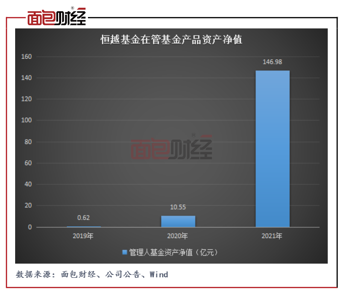 2021年以來,恒越基金的管理規(guī)模快速增加,突破100億元。截至2021年末,恒越基金旗下基金產品規(guī)模合計近147億元,較2020年末的10.55億元增加超過10倍,較2019年末的0.62億元增加超過200倍。