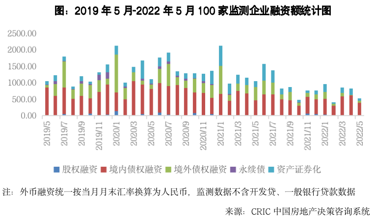 2022年5月100家典型房企的融資總量為519.75億元,環比減少40.3%,同比減少50.2%,單月融資規模是2019年以來第三低。本月融資規模較三四月又有較大的滑坡,主要是因為過去幾個月中作為融資主力的國企央企已經獲得了較為充足的資金,因此在5月的融資規模有所減小,而民營房企的融資規模仍然處于低位。從融資結構來看,境內債權融資390億元,環比減少36%,同比減少17.4%;境外債權融資61億元,環比增加133.5%,同比減少84.4%;本月資產證券化融資69億元,環比減少62.6%,同比減少62.1%。