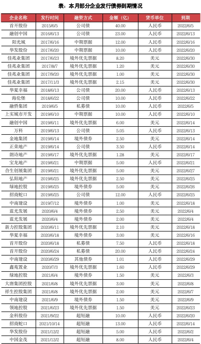 提前關注到2022年6月將有44筆債券到期,合計約639億元,環比增加68.6%,又一波償債潮即將到來。其中,佳兆業到期的4只境外優先票據、新力到期的一只優先票據以及華夏幸福的一筆境外債已經出現了利息違約。從到期債券規模來看,單筆金額最高為佳兆業于2017年發行的8.2億美元的境外優先票據。