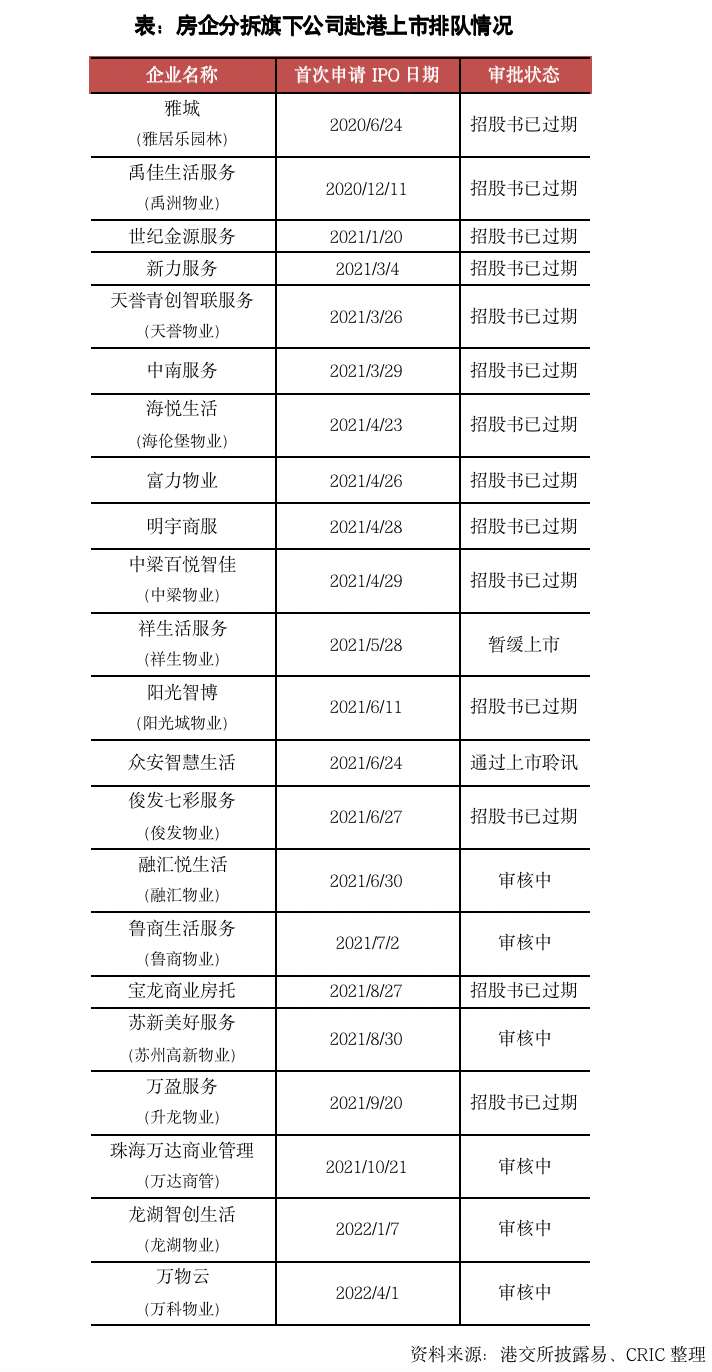 在房企分拆旗下公司上市方面,本月沒有房企旗下公司遞交招股書。因此截至2022年5月底,在港交所遞交過招股書而仍未上市的房企旗下公司共有22家,其中有多家企業的招股書都已過期,未來是否還會堅持上市有待觀察。