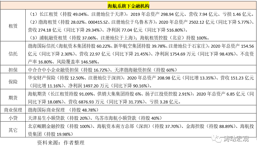 (2)分別擁有渤海租賃(000415.SZ)、海航投資集團(tuán)(000616.SZ)等兩家上市公司,此外在租賃領(lǐng)域還擁有長(zhǎng)江租賃、浦航融資租賃等兩家租賃公司。其中,渤海租賃2020年總資產(chǎn)高達(dá)2502.12億元、營(yíng)收與凈利潤(rùn)分別達(dá)274.18億元和77.04億元,屬于絕對(duì)頭部租賃企業(yè)。
