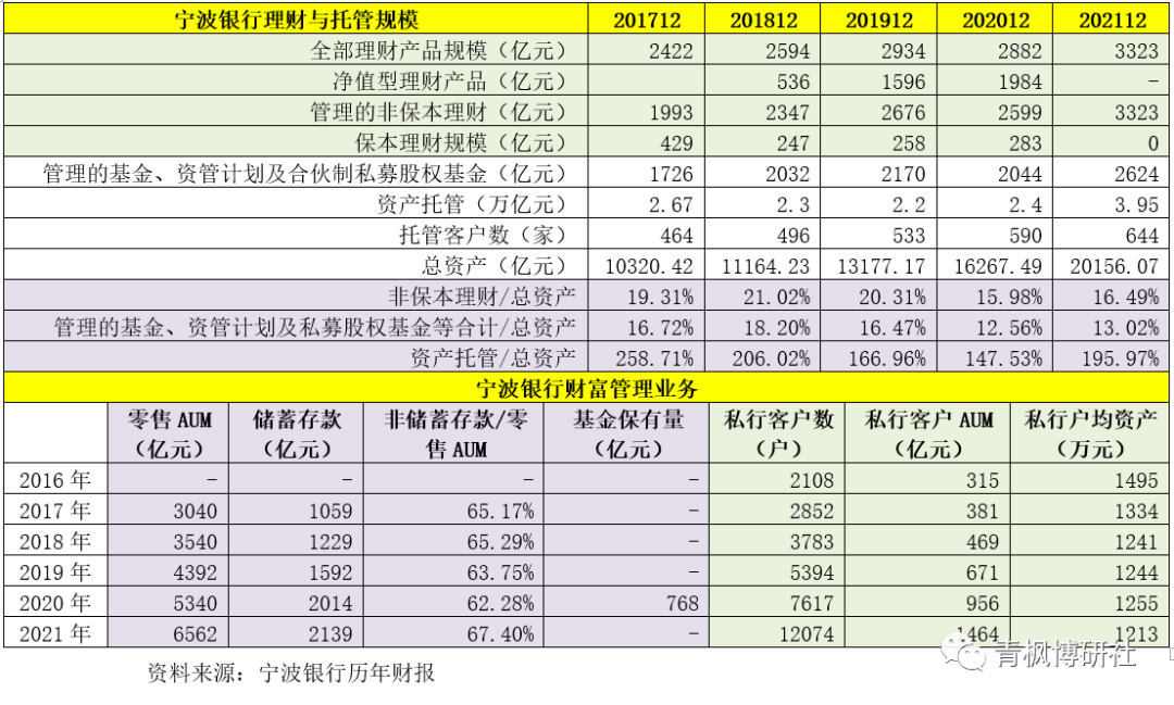 2、截至2021年底,寧波銀行零售AUM達(dá)到6562億元(較年初增加1222億元)、私行客戶AUM達(dá)到1464億元(較年初增加508億元)、私行客戶數(shù)達(dá)12074戶(戶均資產(chǎn)達(dá)1212萬(wàn)元)。其中,在寧波銀行零售AUM的構(gòu)成中,非儲(chǔ)蓄存款占比高達(dá)67.40%。