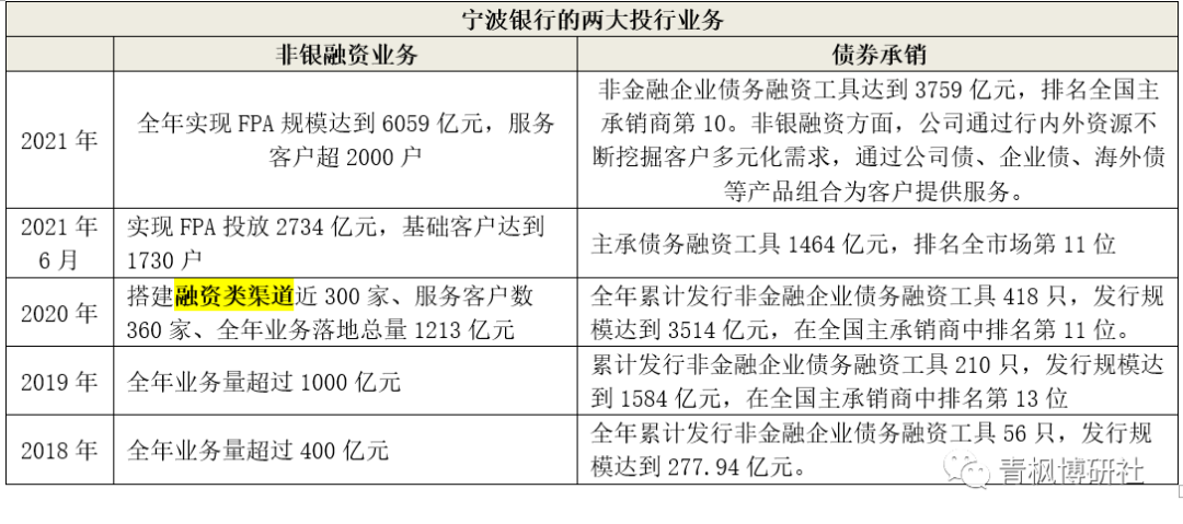 2021年,寧波銀行投行業(yè)務(wù)實(shí)現(xiàn)FPA投放6059億元(債券承銷(xiāo)3759億元)。寧波銀行的投行業(yè)務(wù)致力于為客戶提供投資、融資及顧問(wèn)等綜合金融服務(wù),具體包括債券承銷(xiāo)、ABS和非銀融資三類(lèi)。剔除掉3759億元的債券承銷(xiāo)后,意味著ABS和非銀融資規(guī)模合計(jì)約為2300億元。但是,寧波銀行的非銀融資業(yè)務(wù)具體內(nèi)涵是什么基本上算是黑匣子,其并沒(méi)有給出具體的信息披露。